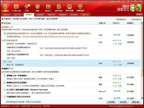 解決方法:使用360安全衛士“清理插件”功能,對于檢測出的紅色字體“惡評插件”選擇“立即清除”,即可一舉消除廣告癥狀。