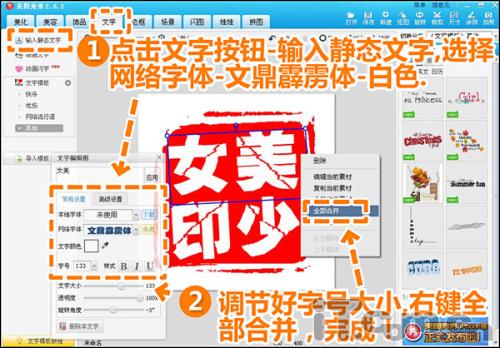 3.接著進入“文字”菜單下,選擇輸入靜態文字,點擊網絡字體,選擇文鼎霹靂體,顏色-白色,調節每個文字的顏色、方向、大小、字與字之間的間距等參數,最后鼠標右鍵“全部合并”,第一個網絡圖章就做好了。