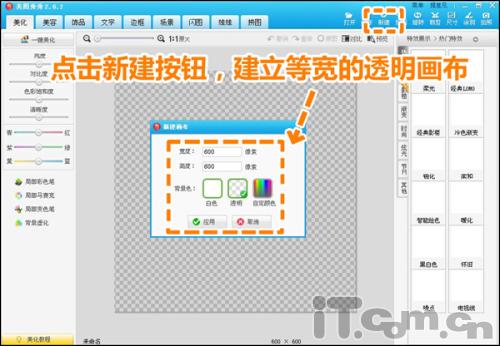 4.如果要做透明水印,就要用到透明的PNG格式,那接下來我們來做第二個圓形PNG格式的圖章,同樣點擊新建菜單,不過這回要新建一個等寬的透明畫布。