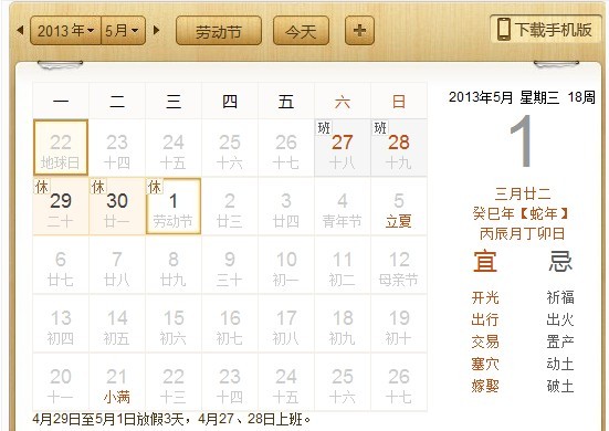 4月27日(星期六)4月28(星期日)上班,4月29日至5月1日放假調休,共3天。5月2日正式上班,放假時間如下圖: