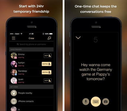 這款應用的開發團隊來自美國,它們熟悉當下年輕人的交友方式,“Sobrr”能讓這些人無所顧忌的暢所欲言,就算拍下了一些讓他們后悔的照片,或說過了一些不合時宜的話也無所謂,適合大膽表達自己的情緒。如果對方是陌生人,你們之間的交流時間僅有24小時,只有在雙方互有好感的情況下才能得到聯系方式,否則你們只是對方生命中的過客。