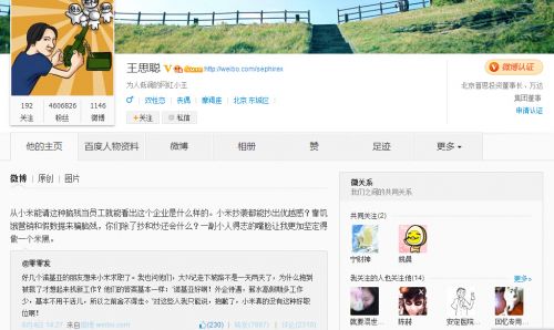 王思聰微博原文:從小米能請這種腦殘當員工就能看出這個企業(yè)是什么樣的。小米抄襲都能抄出優(yōu)越感?靠饑餓營銷和假數(shù)據(jù)來騙腦殘,你們除了抄和炒還會什么?一副小人得志的嘴臉讓我更加堅定得做一個米黑。