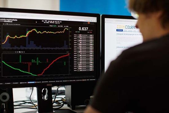 圖為2014年6月30日,荷蘭比特幣公司Bitonic B.V.辦公地內(nèi),員工正在查看比特幣的交易行情。 CFP 圖