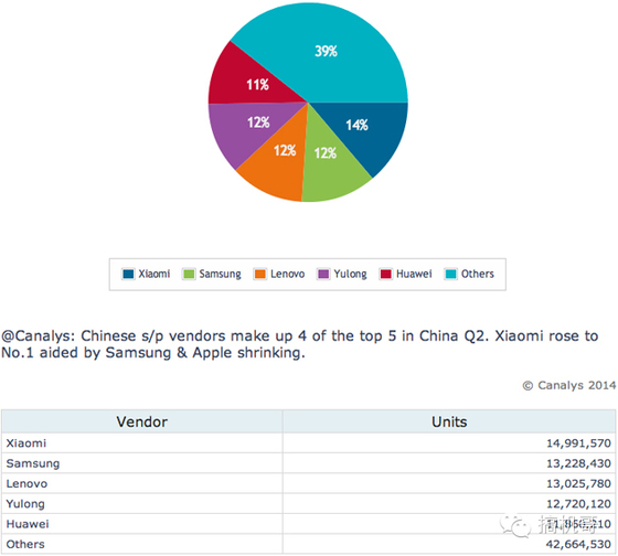 最近 Canalys 公布了一個有關中國智能手機市場狀況的調查,結果顯示在 2014 年 Q2 里,賣得最多手機的頭五位里,有四間都是大陸公司,分別是小米、聯想、酷派和華為,當中小米排第一,而唯一的外國公司就是排在第二的三星,驚喜的是蘋果竟被它們擠到五甲之外呢。