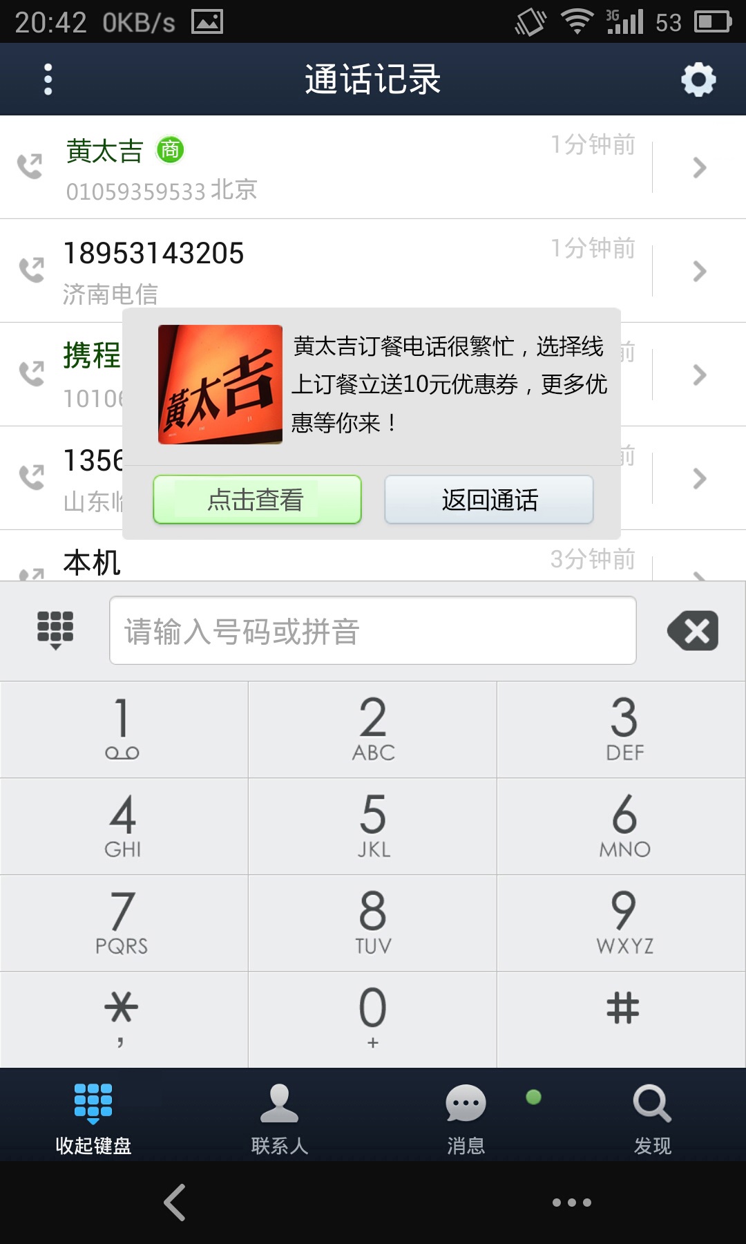 以最近人氣火爆的黃太吉煎餅為例,顧客在給黃太吉打了一個(gè)送餐電話后,即自動(dòng)關(guān)注了黃太吉來(lái)店。隨后,黃太吉主動(dòng)推送最新商品服務(wù)信息,顧客在360通訊錄中看到未讀信息,點(diǎn)擊進(jìn)入后即可查看到黃太吉其他店鋪的相關(guān)信息,并可在線訂餐及商家導(dǎo)航。值得關(guān)注的是,當(dāng)中午訂餐熱線繁忙時(shí),來(lái)店會(huì)提醒用戶轉(zhuǎn)為在線訂餐,并實(shí)時(shí)推送在線訂餐的優(yōu)惠信息,從而避免了因電話不通而造成的客戶流失。