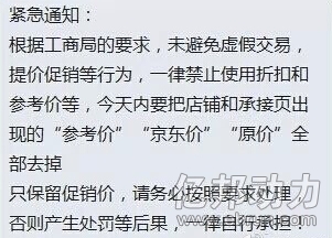 商家截圖顯示,京東已經(jīng)發(fā)布緊急通知,稱工商局要求,一律禁止電商平臺(tái)使用折扣和參考價(jià)等信息,因此,商家必須在今天內(nèi)把店鋪和承接頁(yè)面出現(xiàn)的所有“參考價(jià)”“京東價(jià)”“原價(jià)”等字眼全部去掉;商家只能保留促銷價(jià)。