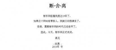 22日,知名字幕分享網站射手網創始人沈晟發表了一則名為“斷·舍·離”的公告,宣布“射手網正式關閉。”