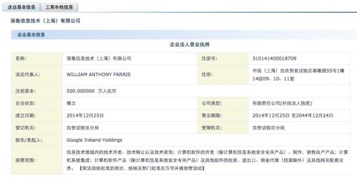 工商資料顯示,澎集信息成立于2014年12月25日,股東為Google Ireland Holdings(谷歌愛爾蘭控股),法人代表是William Anthony Farris,注冊(cè)資本為500萬(wàn)元。該公司的經(jīng)營(yíng)范圍包括:信息技術(shù)領(lǐng)域內(nèi)的技術(shù)開發(fā)、技術(shù)轉(zhuǎn)讓以及技術(shù)咨詢;計(jì)算機(jī)軟件的開發(fā)(除計(jì)算機(jī)信息系統(tǒng)安全專用產(chǎn)品)、制作,銷售自產(chǎn)產(chǎn)品;計(jì)算機(jī)系統(tǒng)集成;計(jì)算機(jī)軟件產(chǎn)品(除計(jì)算機(jī)信息系統(tǒng)安全專用產(chǎn)品)及其他組件的批發(fā)、進(jìn)出口、傭金代理(拍賣除外)及其他相關(guān)配套業(yè)務(wù)。