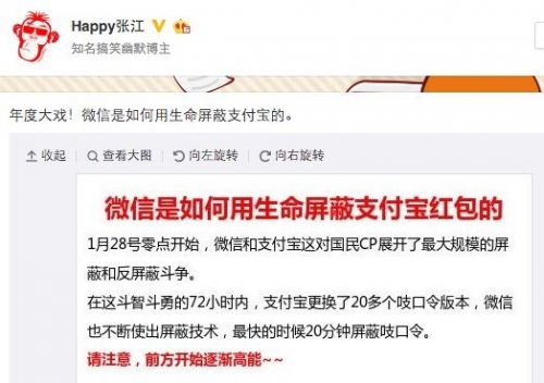 微博網(wǎng)友曝年度大戲:微信與支付寶屏蔽與反屏蔽斗爭(zhēng)