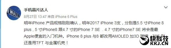 此外,消息人士還強(qiáng)調(diào),2017年的iPhone將有三款,一個(gè)是5.5寸的iPhone 8 Plus,一個(gè)是5寸iPhone 8,至于4.7寸的iPhone SE將成為蘋果便宜的入門機(jī)型,其會(huì)使用TFT材質(zhì)屏幕和金屬外殼,而iPhone 8系列將是AMOLED屏幕,機(jī)身為雙面3D玻璃。