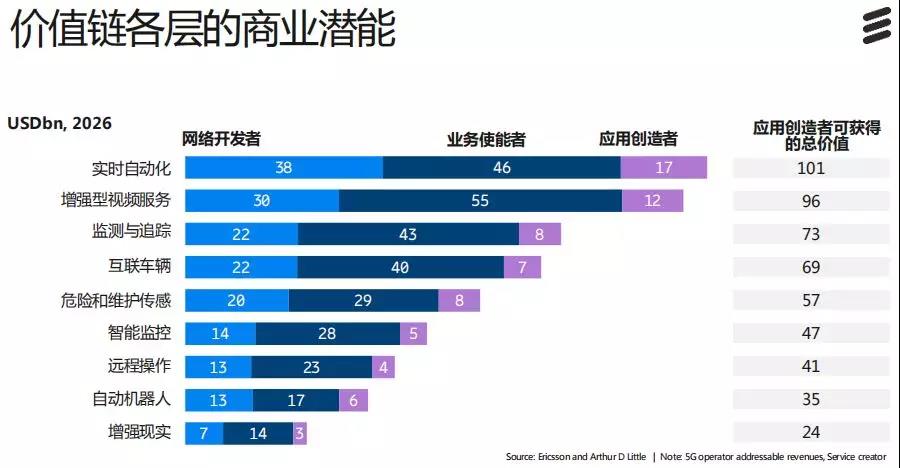 這需要運營商抓時機進行轉型,盡可能處于5G價值鏈的頂層,從原本的角色向業務使能者和應用創造者轉變。愛立信認為,5G可應用在10個行業中超過200個細分場景,到2026年5G帶來的收入中,高達47%可被運營商贏得。