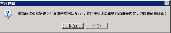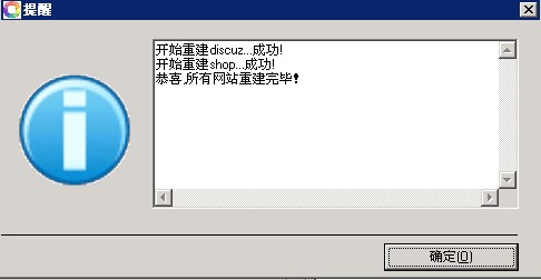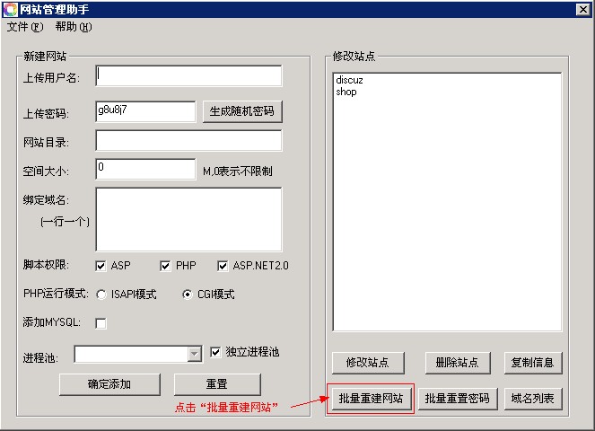 3、點擊提示對話框,會自動打開“網(wǎng)站管理助手”,點擊“批量重建站點”,系統(tǒng)會自動重建用戶賬戶、IIS站點、FTP和mysql。重建成功后會有相應(yīng)提示。