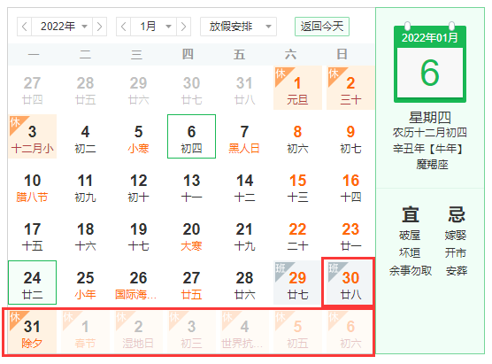 2022年1月30日(星期天)至2022年2月6日(星期天)放假,共8天;2021年2月7日(星期一)上班。